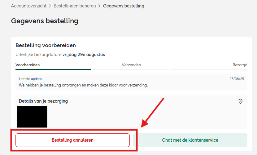 Binnen de eerste 30 minuten na het plaatsen van je bestelling kunnen we het bezorgadres aanpassen of de bestelling annuleren.